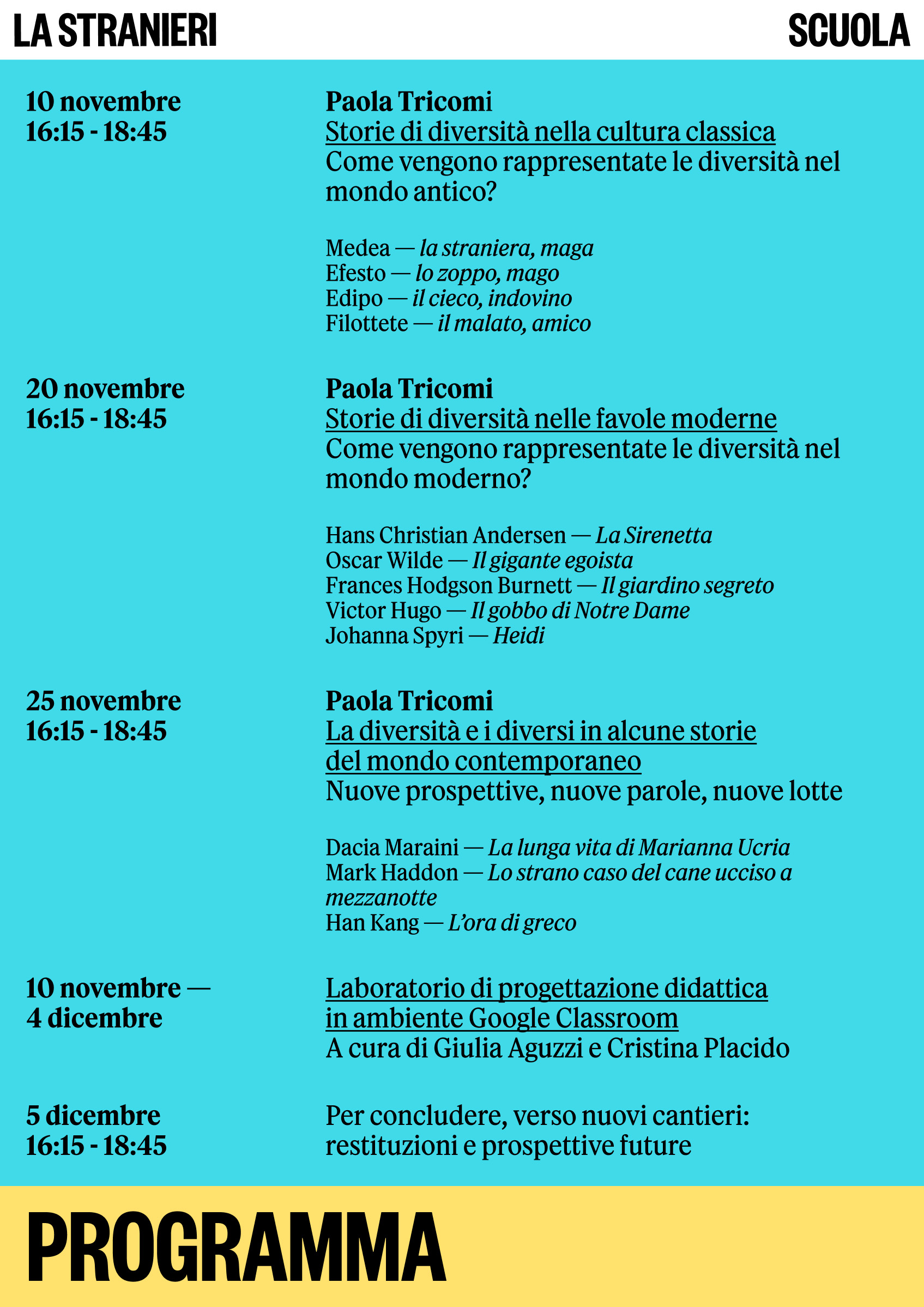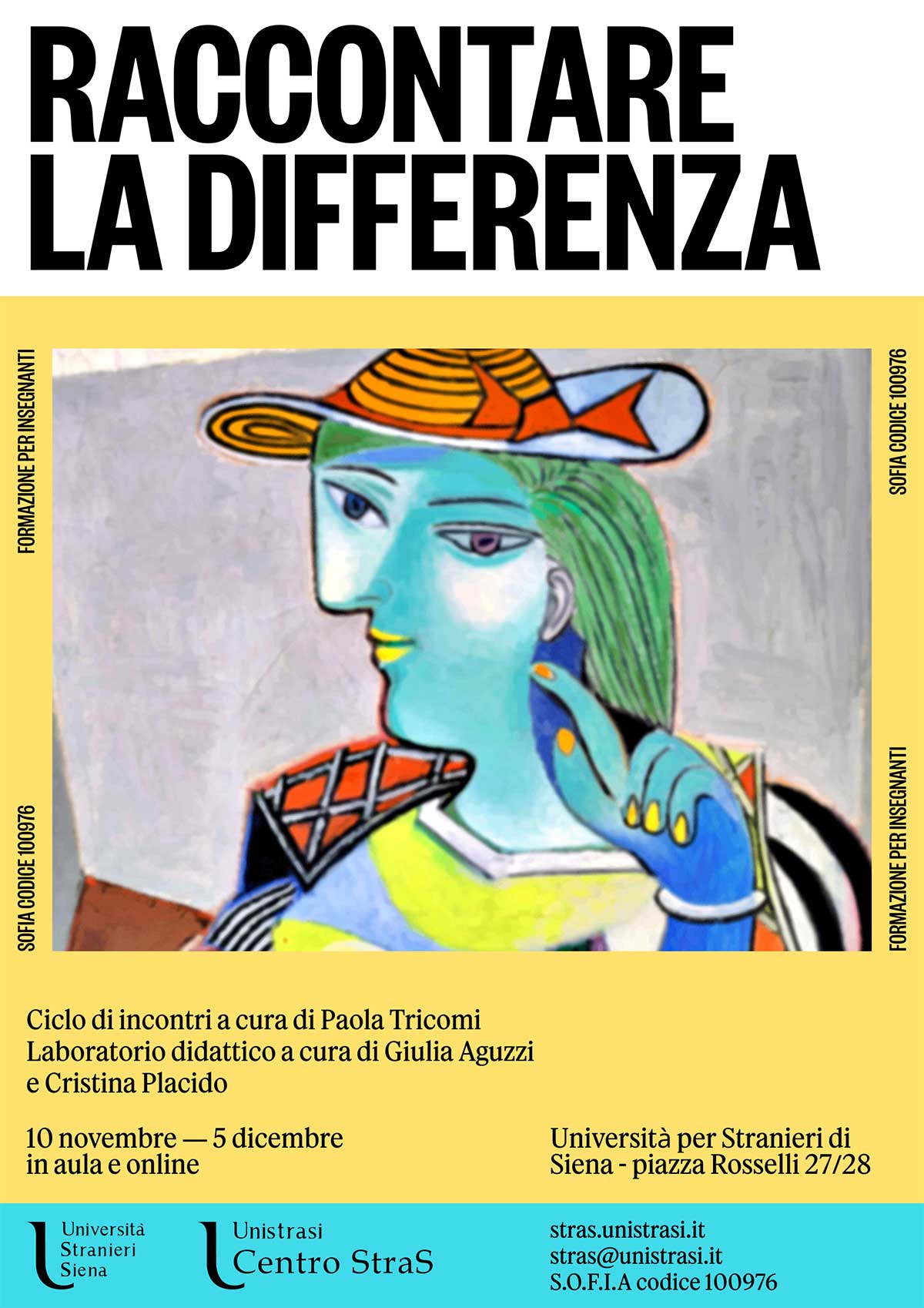 Dal 10 novembre al 5 dicembre si terrà a Unistrasi il corso dal titolo "Raccontare la differenza", che comprende un ciclo di 4 incontri di 3 ore ciascuno tenuti da Paola Tricomi e un laboratorio didattico in ambiente Google Classroom (modalità asincrona) tenuto da Giulia Aguzzi e Cristina Placido.